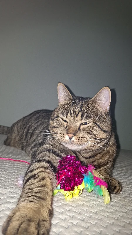 En stor og glad makrellfarget hannkatt som er sky overfor mennesker, men veldig glad i mammaen sin.