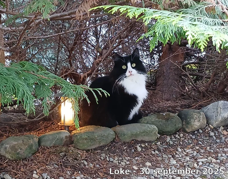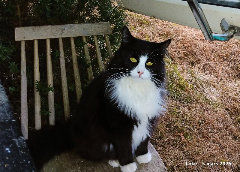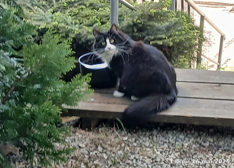 Loke ble funnet gående ute og hjemløs i Askim våren 2024. Han ble ivaretatt av en snill dame som ga han mat og ly. Etter at eier hadde blitt etterlyst i sosiale medier uten hell, adopterte jeg han januar 2025. Da han var hos dyrlegen for chipping, kastrering, vaksinering og generell helsesjekk i januar, ble alderen hans anslått til ca 2 år. Han var veldig tilbakeholden i begynnelsen, men han fant seg til rette og ble trygg i løpet av noen måneder. Han er et "matvrak", vekker meg kl 06 hver morgen med mjauekonsert og forlanger frokost, og nåde den som fraviker fra tiden med mer enn noen minutter. Han er en vakker og kjærlig katt med helt egen personlighet, og jeg har blitt veldig glad i han. Han går godt overens med de andre kattene i nabolaget, og har blitt god venn med nabopusen Mons som er 12 år.
