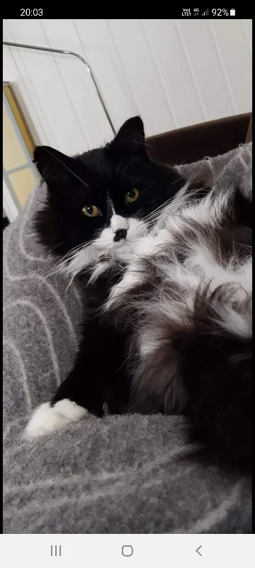Petrus er ei veldig rolig og bedagelig katt som er med dit han kan bli med. Han er med på alle campingturer, teltturer, hytteturer, bilferier osv osv. Han har vært med på kryss og tvers både i Norge, Sverige og Danmark. Han går fritt der han er kjent og i bånd der han ikke er kjent. Han elsker å kose seg, liker godt å ligge i senga og er veldig glad i mat. Han elsker magekos og det å bli børstet er det beste han vet. Det er som spabehandling for han. Han er veldig god til å passe på meg som er kronisk syk. Han har mye omsorg, kos og kjærlighet å gi bort til meg (-men ikke en dritt til noen andre...he he 🙈🤣) Vi er like avhengige av hverandre begge to ❤️😻❤️