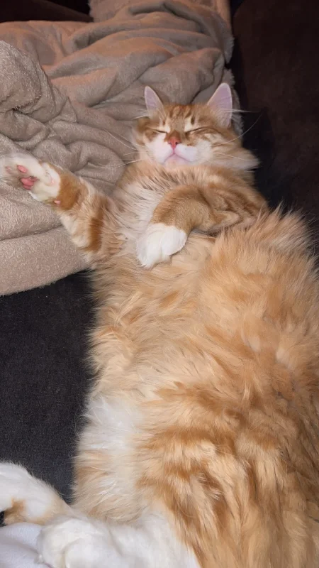 Jeg elsker våtfôr og maser gjerne i en halvtime for å få viljen min. Elsker å bli bært rundt på, og leke sisten med foreldrene mine. Har også verdens snilleste bonussøster som er en staff. Hun er den første jeg hilser på når jeg kommer inn etter en tur på jakt.