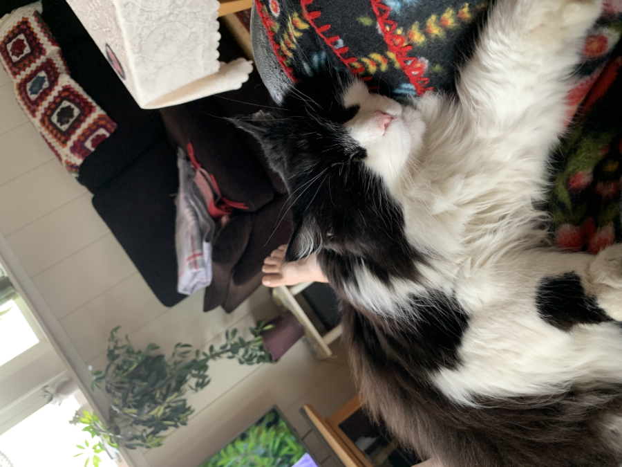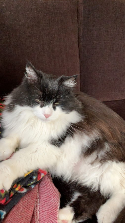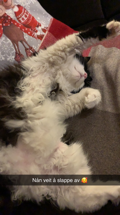 Dette er mors lille Bjarne ( omentrent 7,5 kg ). Han er ute hele sommeren. Men kommer inn hver kveld. Når det blir kaldt på høsten ligger han for det meste inne.