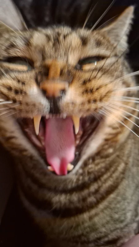 En stor og glad makrellfarget hannkatt som er sky overfor mennesker, men veldig glad i mammaen sin.