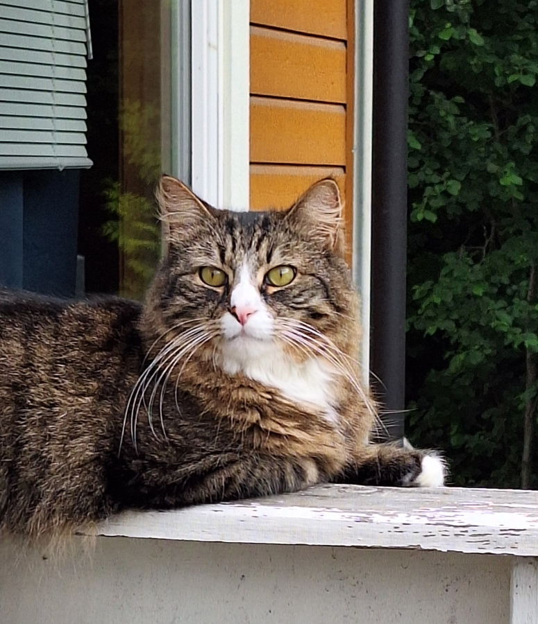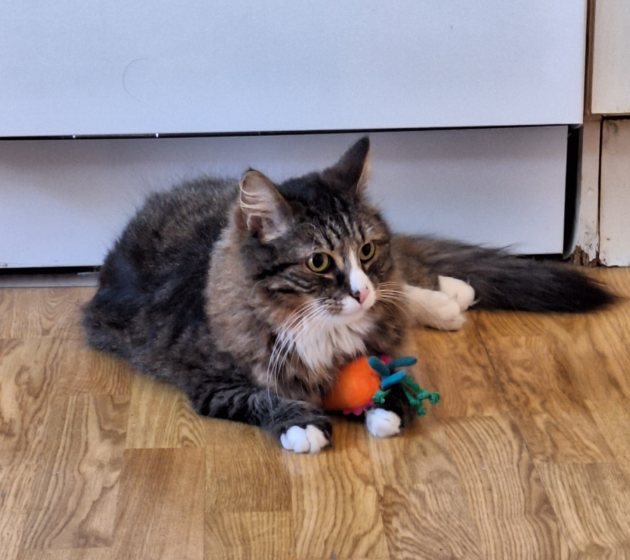 Ragnar er en livlig og kjærlig gutt som kom til meg på omplassering i april 2021. Da var han veldig skeptisk og redd nye mennesker, men vi overvant den frykten sammen etter en stund. Nå bor han sammen med 3 andre katter hvor 2 av dem er han blitt så glad i at han har tatt dem til seg som sine egne barn. Ragnar elsker å slappe av, leke mye og være med mor ut på tur i rullestolen hennes. Han er også mors emosjonelle støttedyr og hjelper med å roe angst og ptsd