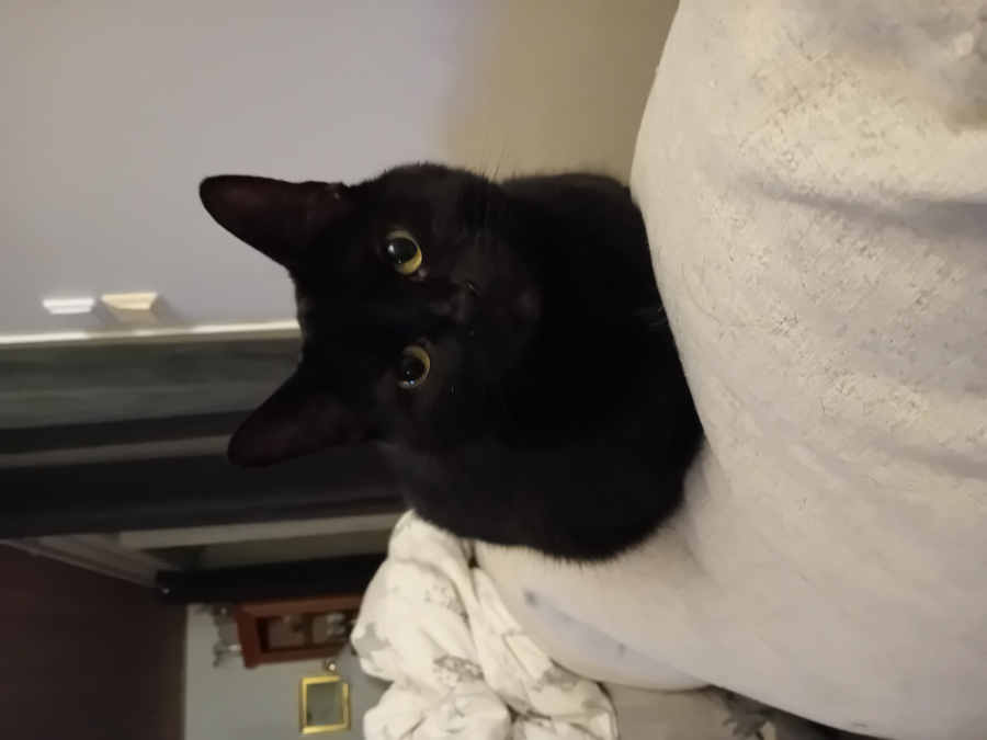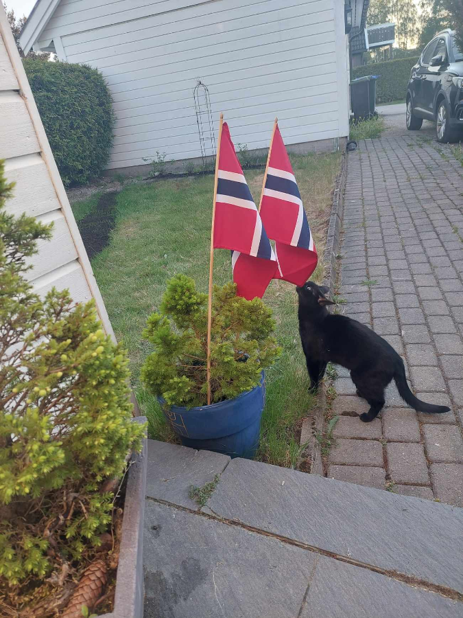 Svarten kom til oss i august 2014 som omplasseringskatt fra Moss og omegn dyrebeskyttelse. Svarten er en hunkatt som fikk navnet sitt av guttene i huset her. De ønsket seg hannkatt, men så viste det seg at kullet på fem små bare var hunner. Navnet ble beholdt likevel. Svarten er redd for fremmede og knurrer til dørklokka når det ringer på (før hun løper og gjemmer seg). Hun kan åpne dører ved å hoppe opp og slå ned håndtaket. Heldigvis klarer hun ikke ytterdøra. Hver natt er hun å finne i matmors seng i fotenden. Hun er litt sær når det kommer til kos og vil kun ha kos av matmor. Hun vokter hagen vår og går sjelden utenfor vår egen tomt.