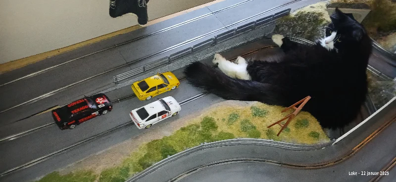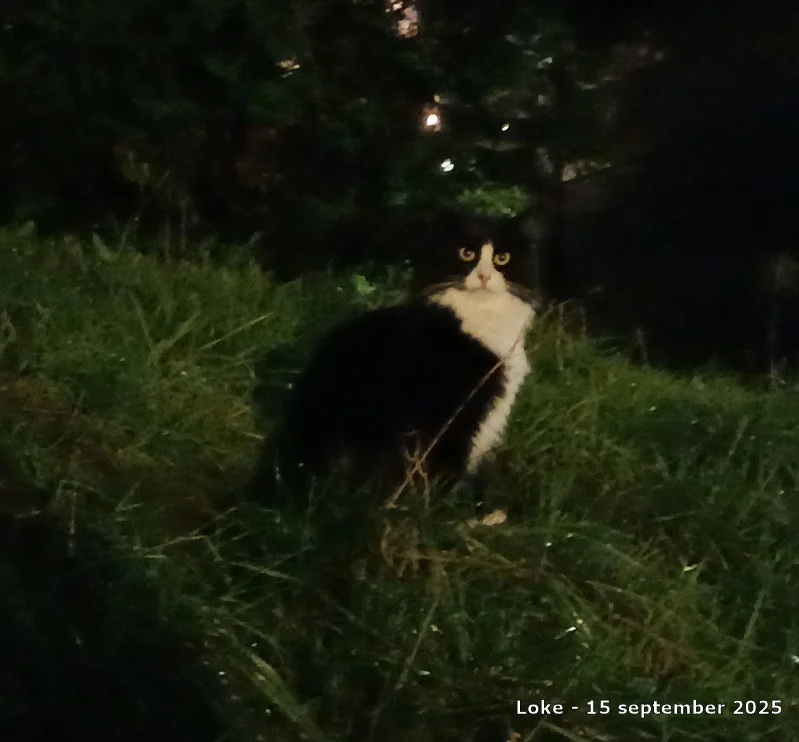 Loke ble funnet gående ute og hjemløs i Askim våren 2024. Han ble ivaretatt av en snill dame som ga han mat og ly. Etter at eier hadde blitt etterlyst i sosiale medier uten hell, adopterte jeg han januar 2025. Da han var hos dyrlegen for chipping, kastrering, vaksinering og generell helsesjekk i januar, ble alderen hans anslått til ca 2 år. Han var veldig tilbakeholden i begynnelsen, men han fant seg til rette og ble trygg i løpet av noen måneder. Han er et "matvrak", vekker meg kl 06 hver morgen med mjauekonsert og forlanger frokost, og nåde den som fraviker fra tiden med mer enn noen minutter. Han er en vakker og kjærlig katt med helt egen personlighet, og jeg har blitt veldig glad i han. Han går godt overens med de andre kattene i nabolaget, og har blitt god venn med nabopusen Mons som er 12 år.