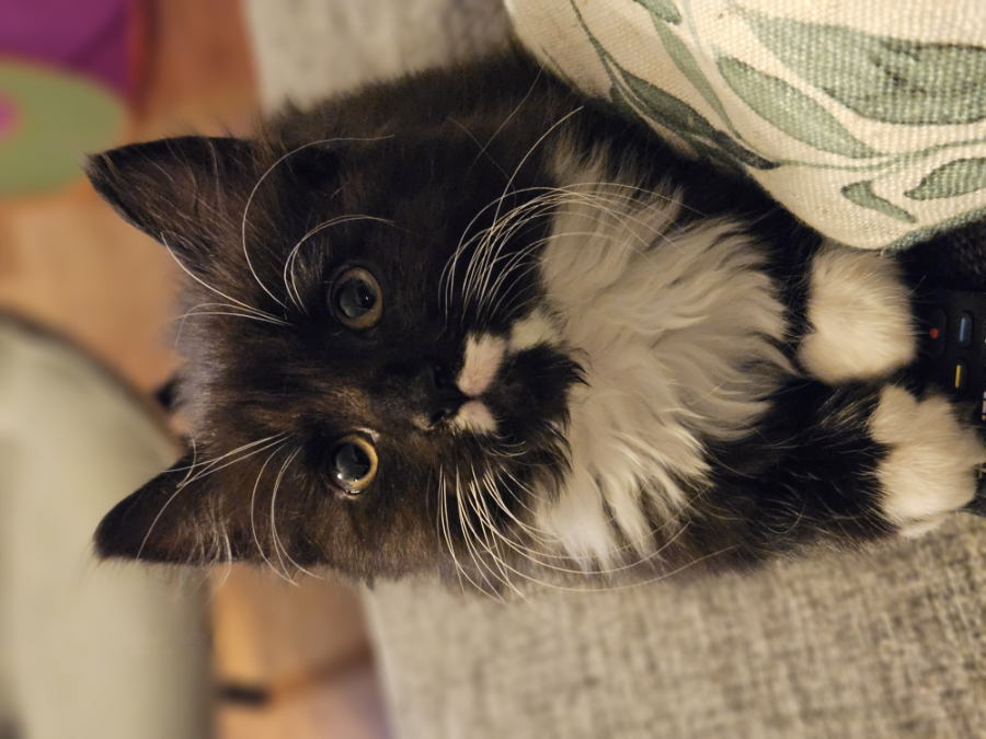 Selma er ei innepus, slik som sine brødre, men de har god tumleplass med 4 etasjer å leke i. Hun bor også med hunden Theo som også er en god og tålmodig venn for henne.