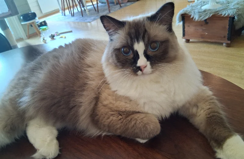 Lui er av rasen Ragdoll. Han er innekatt og er en veldig ønsket katt som betyr mye for meg i verdagen. Født på min og min avdøde manns bryllupsdag.