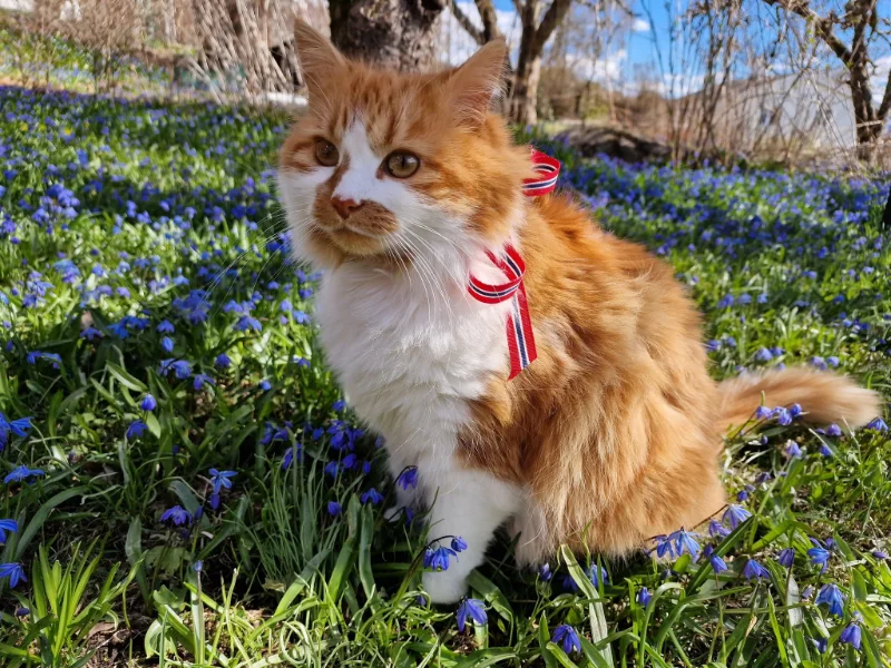 Malin kan se ut som hun er i slekt med Jesper og Kasper, kanskje er de det? Hennes opphav er ukjent, men at det var Malin denne skjønningen het, var klart med en gang vi traff henne, hun er er ordentlig malemaskin! I tillegg betyr "malin" smart og lur på fransk, og det passer bra på en intelligent katt med franske familiemedlemmer. Hun kan være litt temperamentsfull hvis det blir for mye kamming av pelsbukser eller annet mas, men er stort sett en snill kosepus. Hun er veldig glad i å jakte på alt som fyker rundt i luften når det blåser, og liker ellers godt å klatre i frukttrær og særlig å studere måker og andre sjøfugler om sommeren. Inspirert av Jesperpus er hun også ofte med i sekken på tur med hundefølge, og går gjerne en bit i langline selv og. Hun er veldig observant og kan gjøre turfølget sitt oppmerksom på dyr og fugler vi ellers ikke ville oppdaget. Malin er til stor glede for de to- og firbeinte hun bor sammen med!
