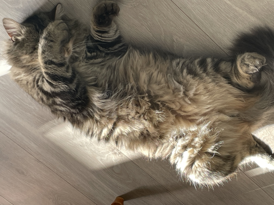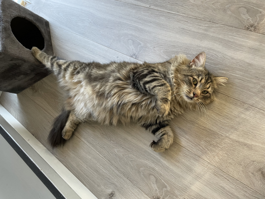 Samson ble adoptert fra Dyrebeskyttelsen i juni 2024. Han var veldig klar for et nytt hjem og fant seg fort til rette. Etter en rask inspeksjon av sitt nye hjem la han seg på ryggen og viste med hele seg at vi var akseptert som hans tjenere.