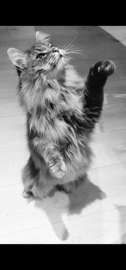 Han er en gammel herremann som liker seg forran ovnen, kan klappes men på hans premisser. Liker å tigge mat og gir du han ikke så forsyner han seg selv. Han er en gårdskatt med mange oppgaver (de fleste gjør han ikke) og på sine eldre dager så kommer han løpende inn utenfra for å gå i kassen...