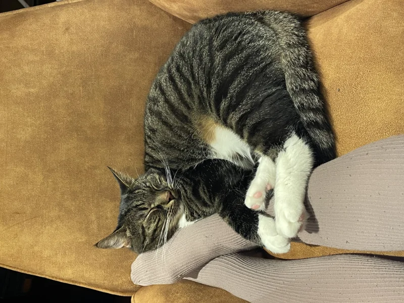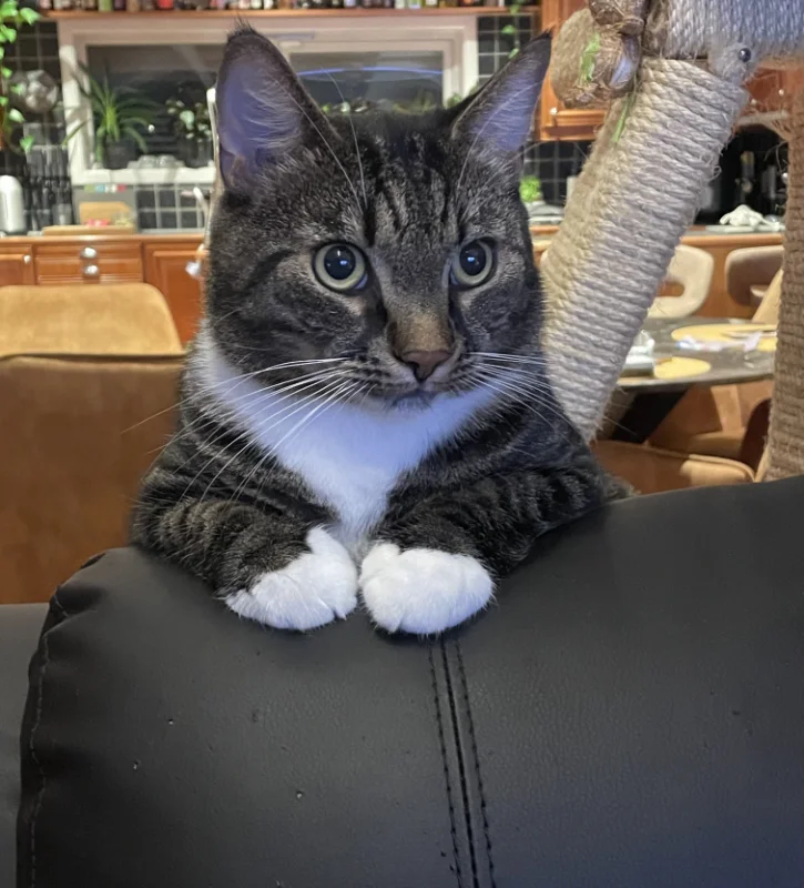 Purre har bodd hos oss siden 5. november. Han ble fanget inn 1. juni av Hjerte for hjemløse katter. Han er vaksinert og chippet. Han har funnet seg godt til rette, han er trygg, vil leke og kose. Det er mye hodedunking og han har begynt å hoppe opp i fanget. Favorittplassen er på et lite teppe foran peisen.