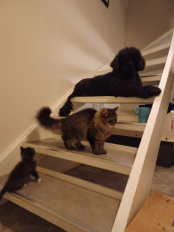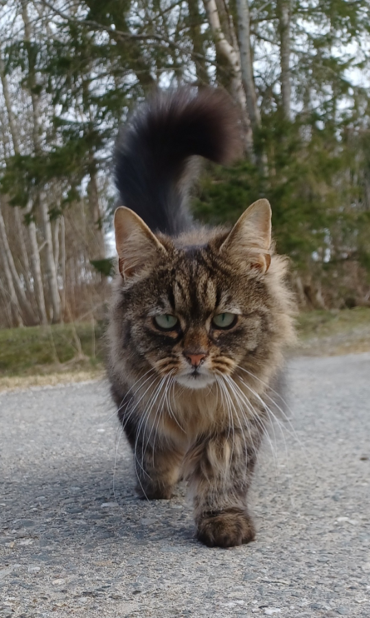 Hun er en liten frøken på 2,4 kilo. Hun er ikke veldig aktiv, men trives godt med å leke med ballbanen og følge med i nabolaget. Hun bor med "kattebror" Wiggins og hunden Maja. Det er som regel flere fosterhjemskatter også. Det tar hun godt vare på.