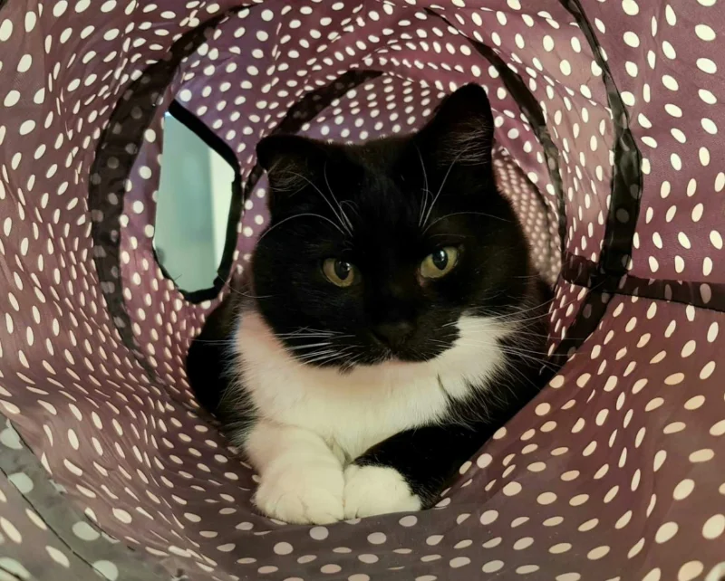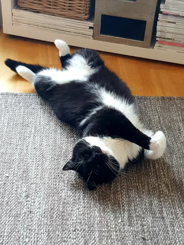 Matglad og aktiv. Elsker å sitte i vinduet eller på verandaen og kikke på fuglene og bilene.