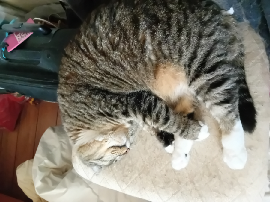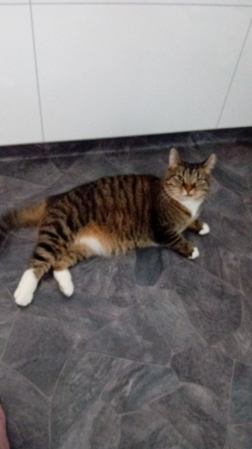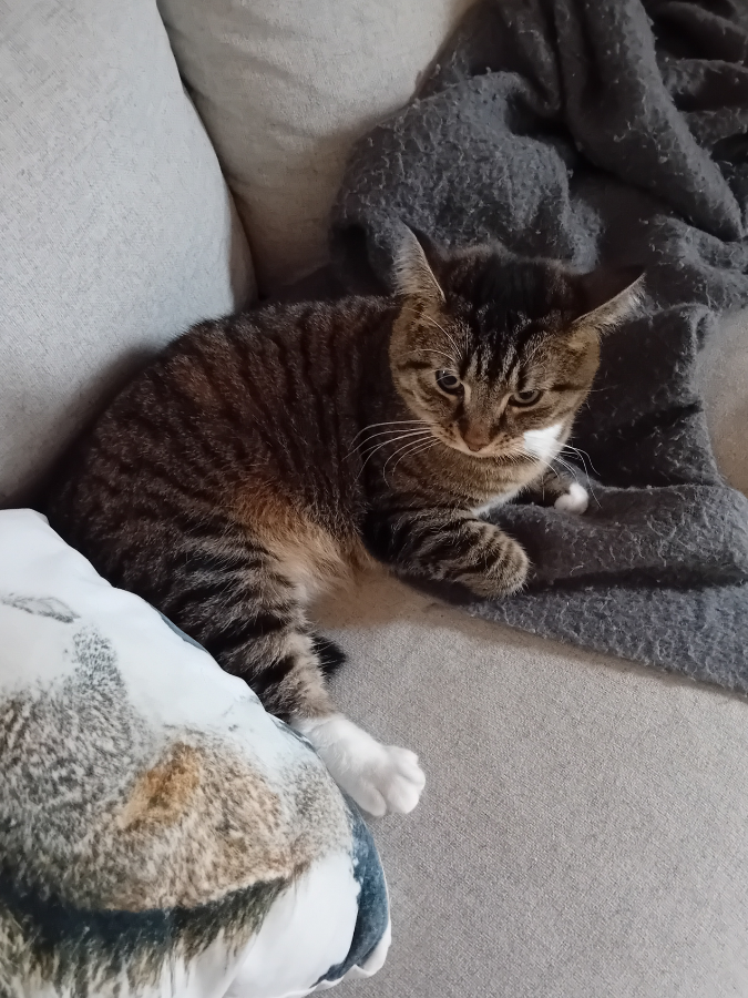 Sarah kom til oss i desember 2019 som omplasseringskatt fra Moss og omegn dyrebeskyttelse. Hun er nysgjerrig og pratsom med oss som eier henne, men reservert overfor fremmede. En kveld i mai 2020 kom hun haltende hjem. Det viste seg at noen må ha sparket til henne slik at hun brakk lårbeinet. Etter operasjon og uker i hundebur på rommet til sønnen min, kom hun til hektene igjen. Etter dette har vi vært redde for å slippe henne ut på egenhånd. Sarah er kosete og god. Klager ikke over å være inne. Leker med musene sine og vår andre katt.
