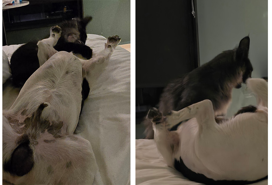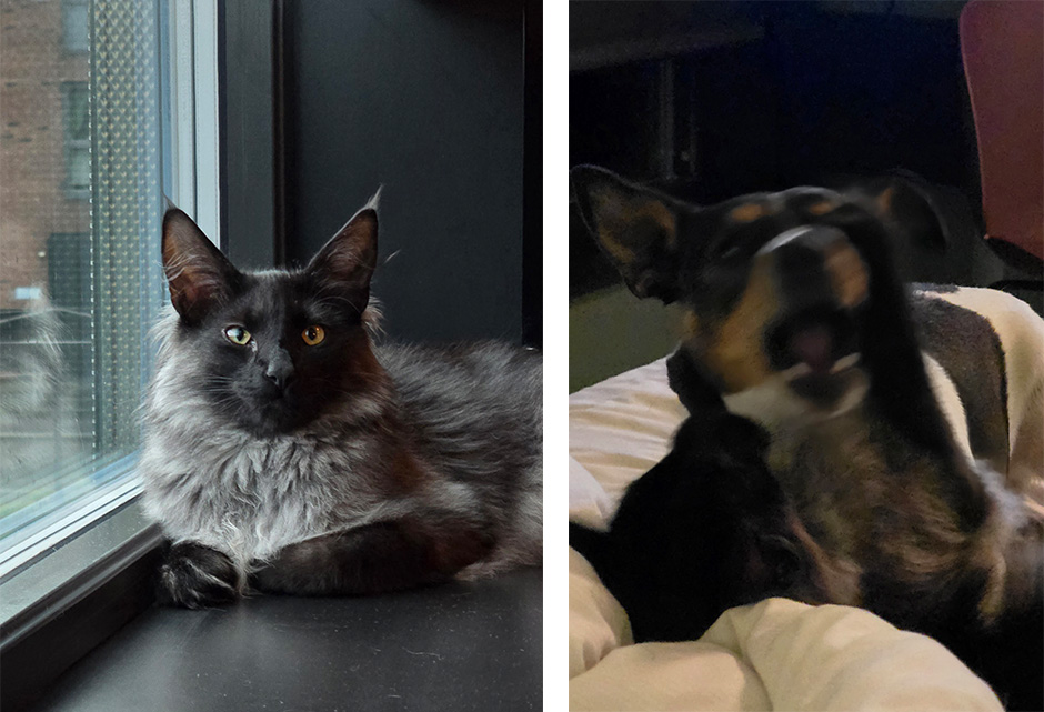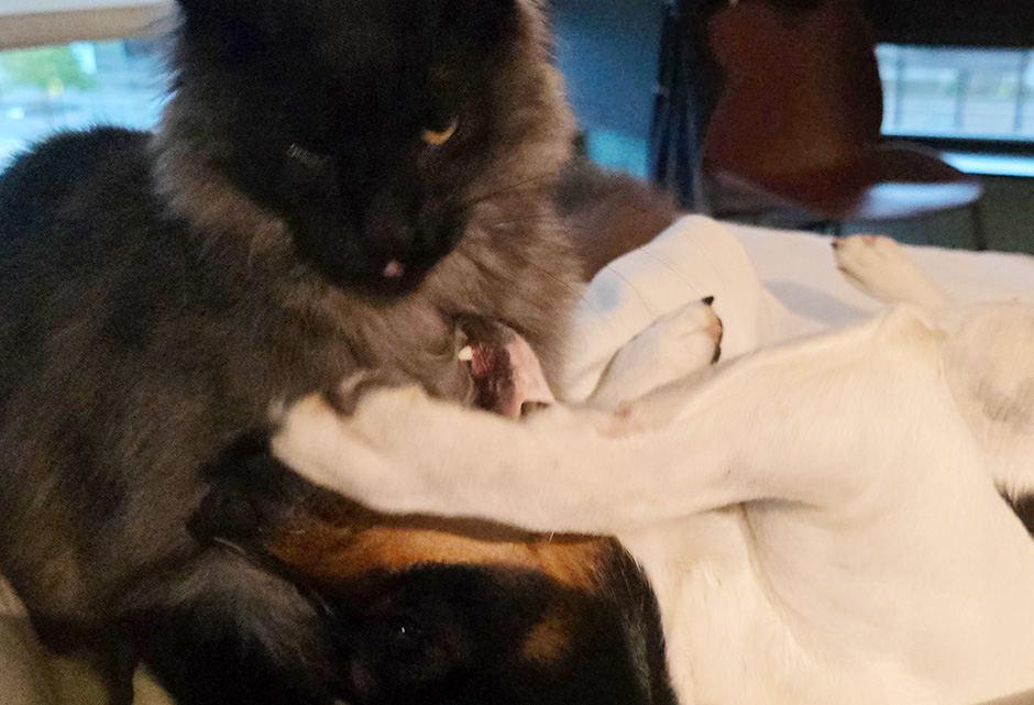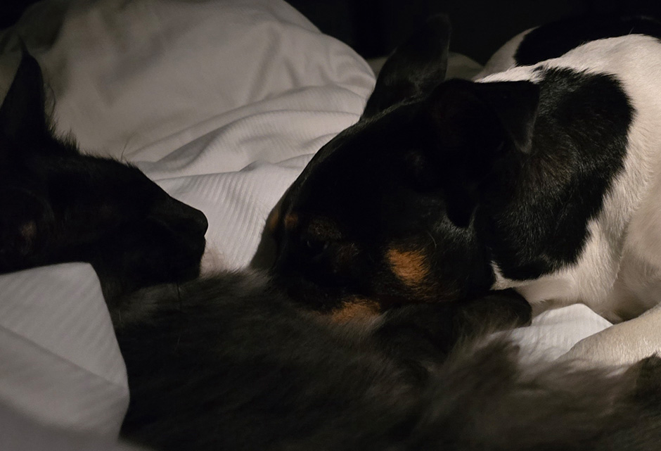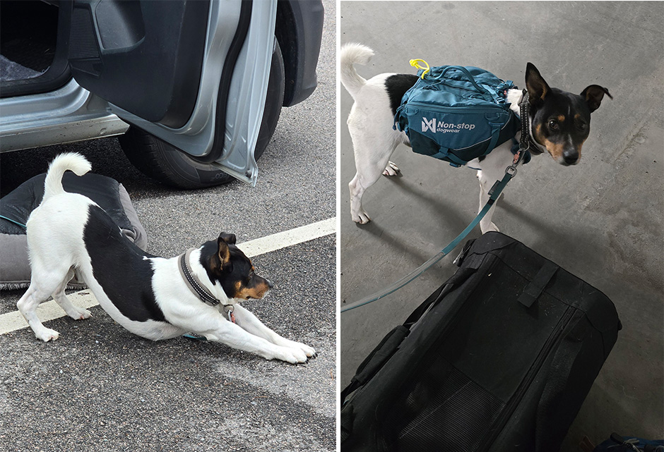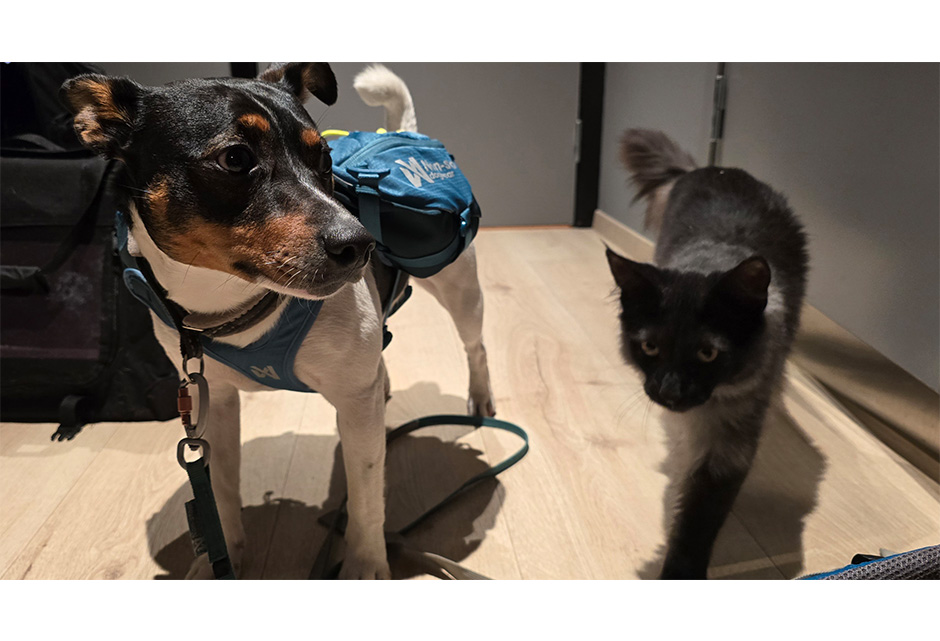The next morning, the paw gang was ready for action at 4 AM. They had taken over the windowsill like little spies, growling at staggering passersby and an entire flock of breakfast-hunting pigeons. Mom refused to get up. But by 7 o’clock, she managed to drag herself out the door with the fur crew. She hauled the wheeled suitcase with the cage on top and shuffled off toward the elevator, while Odin trotted happily in front with his travel bag on his back.
