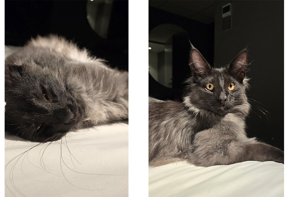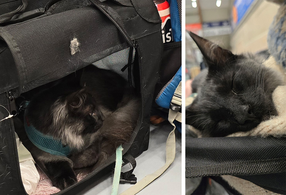 But the judges smiled. Whether it was the ridiculous hairstyle or the humming motor sound that won them over, we don’t know—but Jonatan charmed them anyway. Afterwards, he took a well-earned nap (or hum) in the cage while we waited and waited… because that’s what most of a cat show is. An exam in patience.