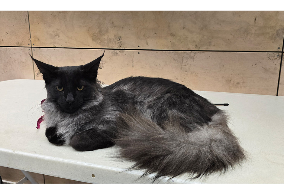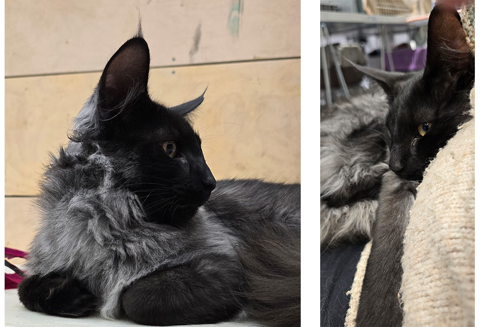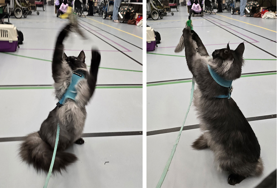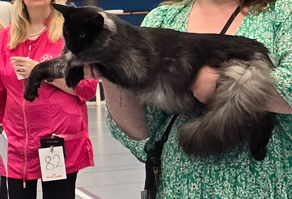 Jonatan was due in the ring almost immediately, so grooming was replaced with a few quick shakes out of the cage and a little bouncing on the way to the judge’s table. But this day, it was a completely different kitty standing there.