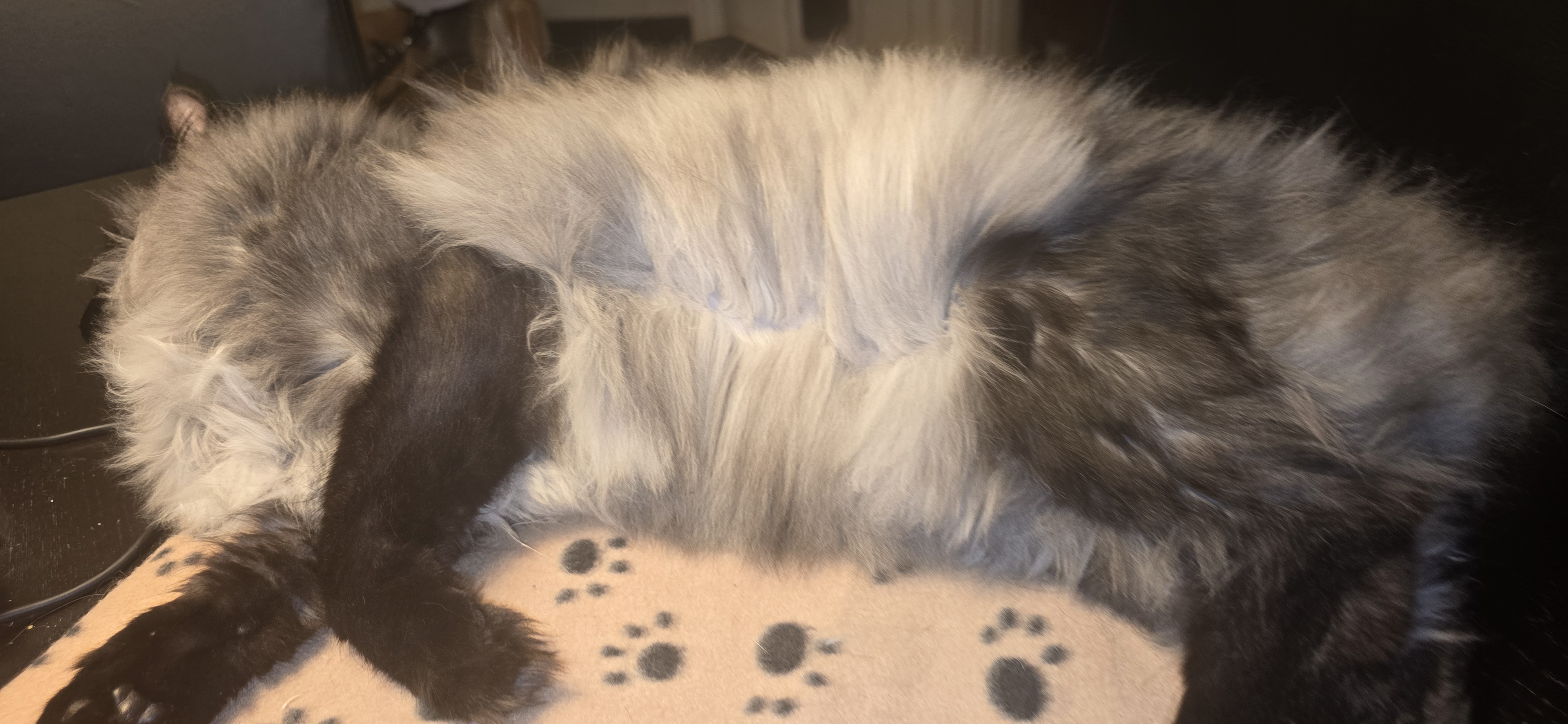 Now that he’s a senior cat, he spends more time indoors, and his undercoat has thinned out with age.